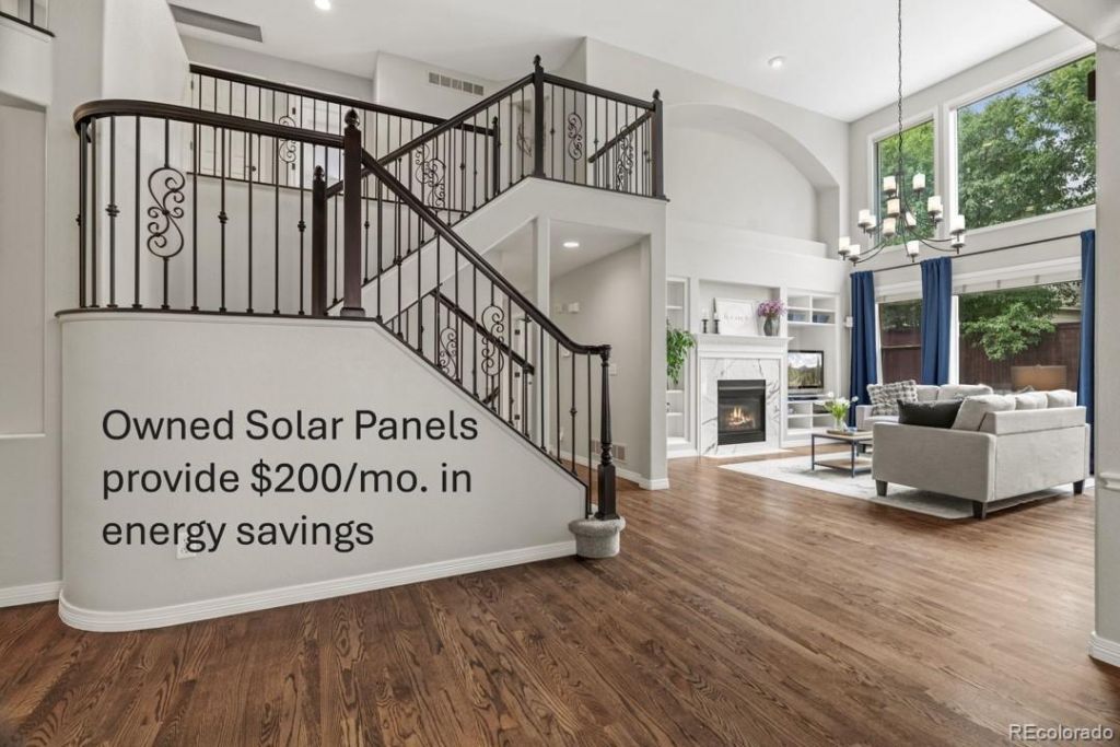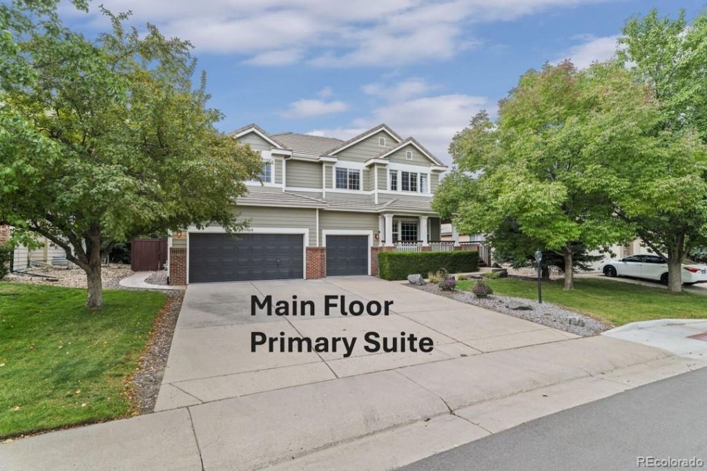 This beautifully appointed home offers the convenience of single-level living with a main-floor primary suite featuring a spa-inspired five-piece bath and generous walk-in closet. The open floor plan showcases vaulted ceilings, a private office with French doors, formal dining room, and great room with marble-surround fireplace. The eat-in kitchen is equipped with quartz countertops, stainless steel appliances and pantry. A spacious laundry room completes the main level, providing everything you need for comfortable daily living.Owned solar panels (not leased) provide an estimated $200 monthly savings on utility bills, offering both environmental benefits and long-term financial value.The second floor includes two bedrooms sharing a Jack & Jill bath, plus a second primary suite with jetted tub. The finished basement expands your living space with a theater room, wet bar, bedroom, full bath, and bonus exercise/craft room.Relax in your private backyard featuring a stamped concrete patio with retractable awning. Heritage Hills residents enjoy two swimming pools, six pickleball/tennis courts, two playgrounds, and three-foot sidewalks winding through beautifully landscaped common areas.Walk to Starbucks, Snooze, Sprouts, and numerous restaurants via a wide, safe path crossing the iconic Lone Tree leaf pedestrian bridge. Low HOA fees. Minutes from Schwab campus, Sky Ridge Medical Center, Park Meadows, trails, parks, light rail, dining, and entertainment.